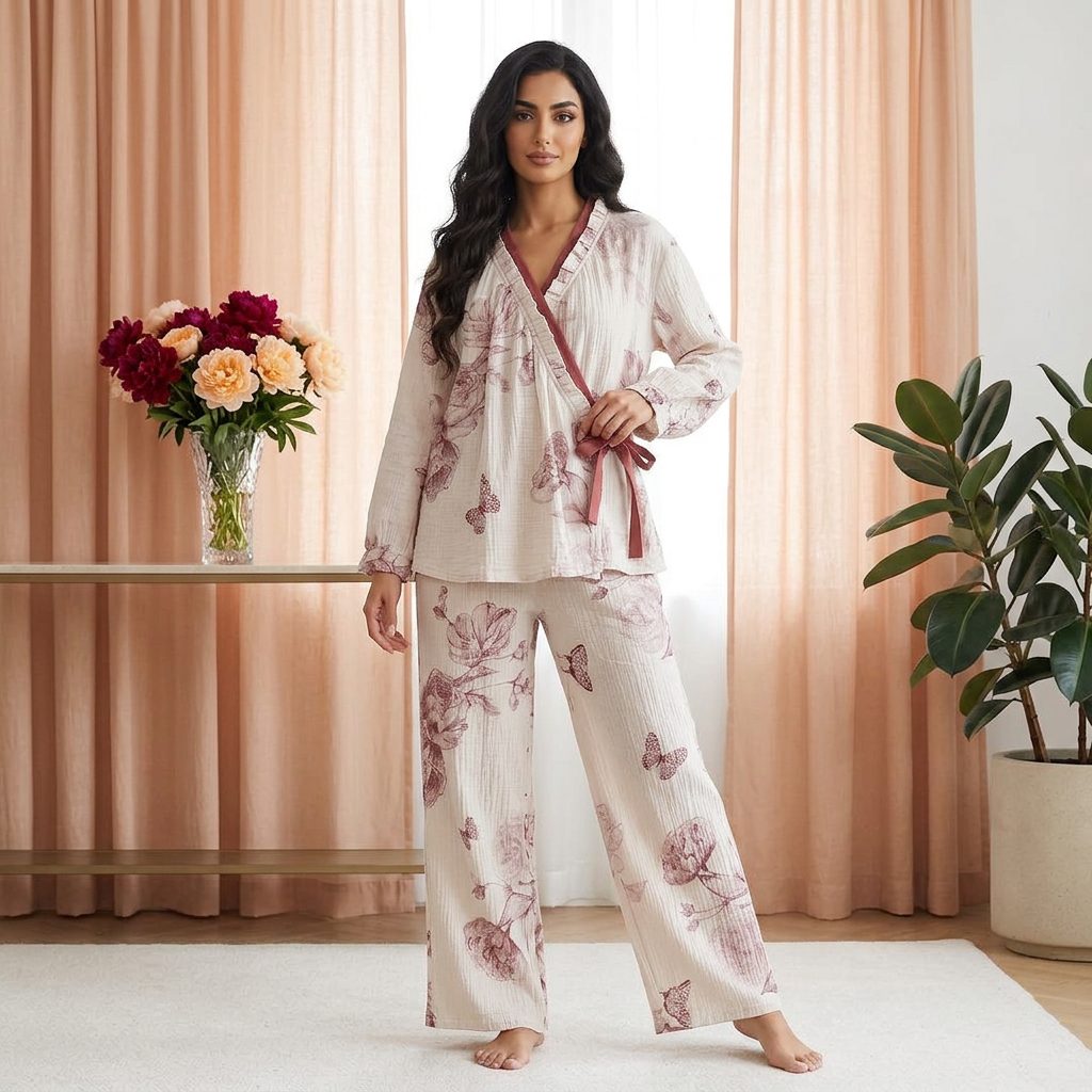 Sleep and lounge in soft romantic comfort with this two-piece pajama set in airy cream gauze, adorned with delicate mauve floral sketches and butterfly accents. The wrap-style long-sleeve top is finished with ruffled trim and a contrast tie closure, paired with matching wide-leg pants for an elegant, feminine look.