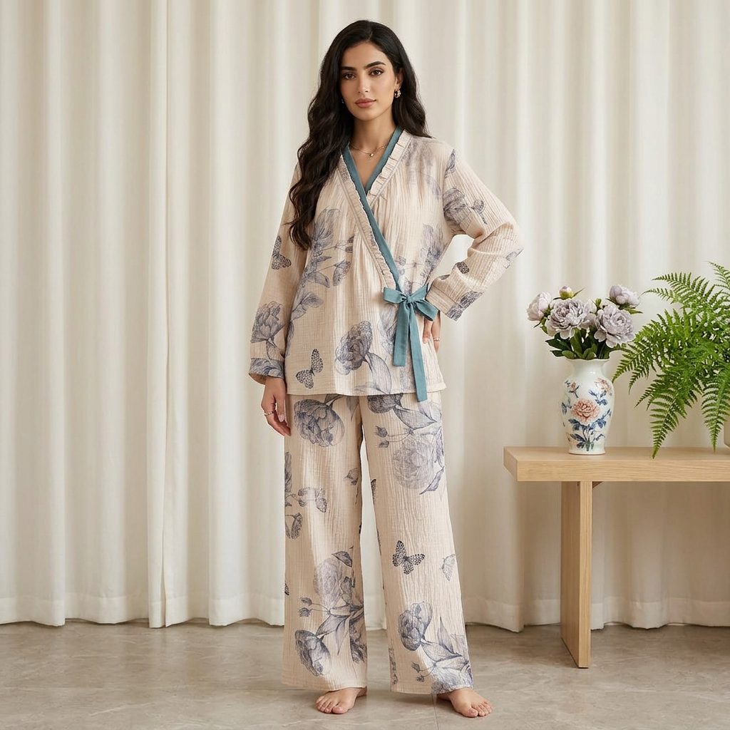 Sleep and lounge in soft feminine elegance with this two-piece pajama set in blush pink, adorned with oversized watercolor-style floral blooms. The relaxed V-neck button-front top pairs with matching wide-leg pants for a graceful and comfortable everyday sleepwear look.