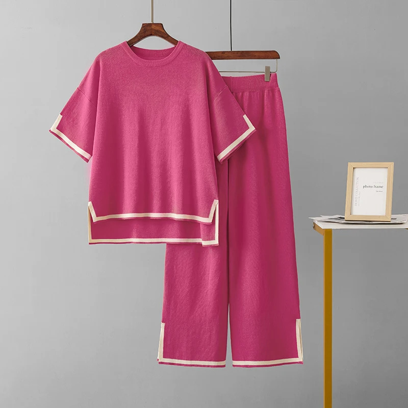 Elevate casual comfort with this two-piece lounge set in rich forest green knit, featuring a short-sleeve crew neck top and wide-leg pants with slits. Crisp white piping along the edges creates a sporty, structured silhouette perfect for relaxed home wear.