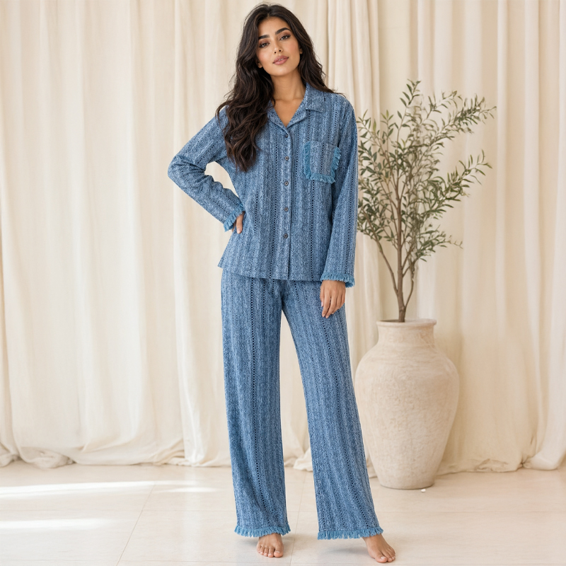 Unwind in retro-inspired comfort with this two-piece women’s pajama set, featuring a long-sleeve button-up top and matching full-length pants in an all-over geometric floral print. Finished with contrast piping and a classic relaxed fit, this set brings a warm, stylish feel to lounging and sleep.